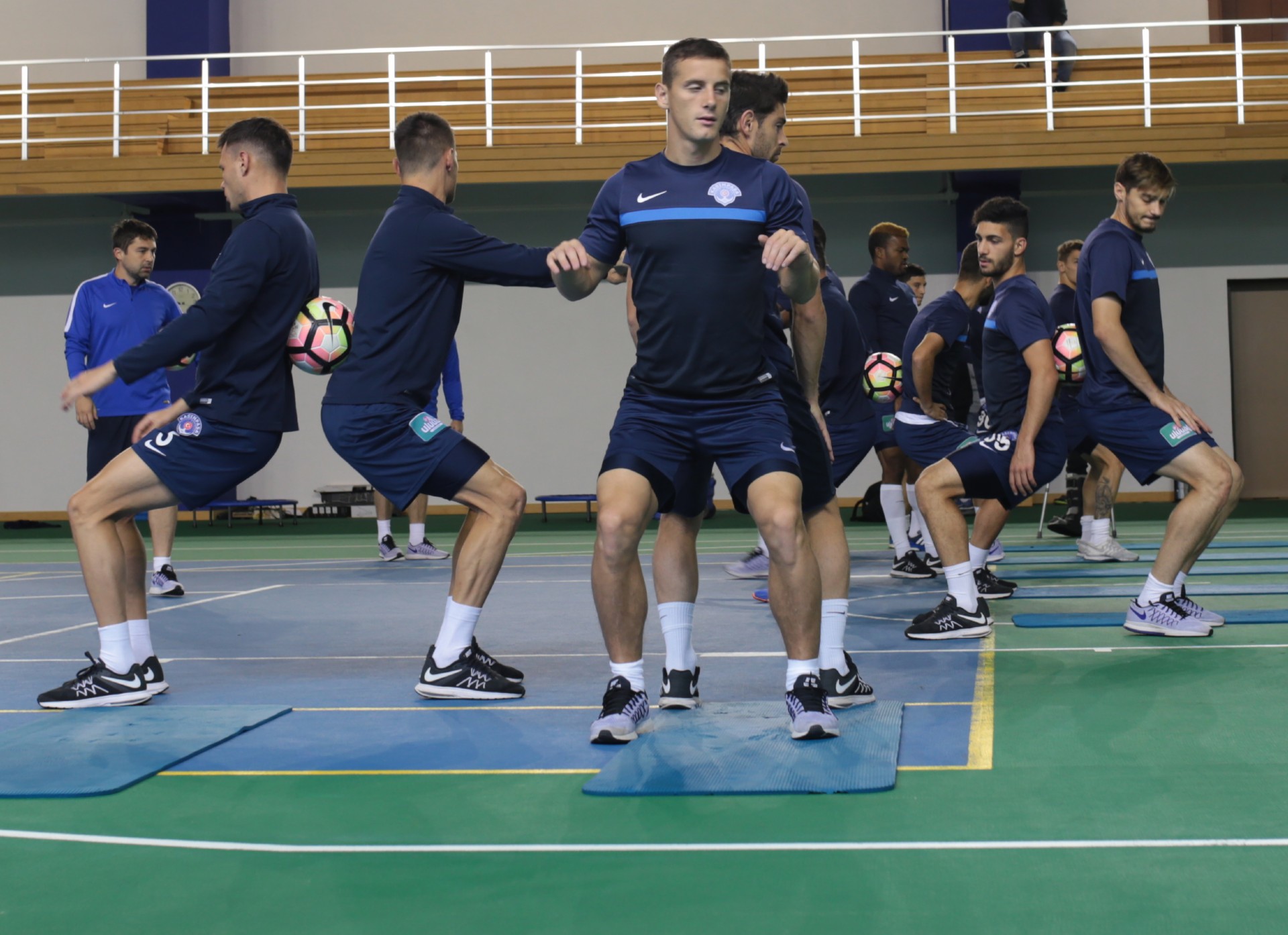 Antrenman takım halinde salonda yapılan ısınma hareketleri ve streching çalışması ile başladı. 7 istasyondan oluşan parkurda oyuncular üç tur üzerinden değişmeli olarak denge ve kuvvet çalışmalarını tamamladılar.
