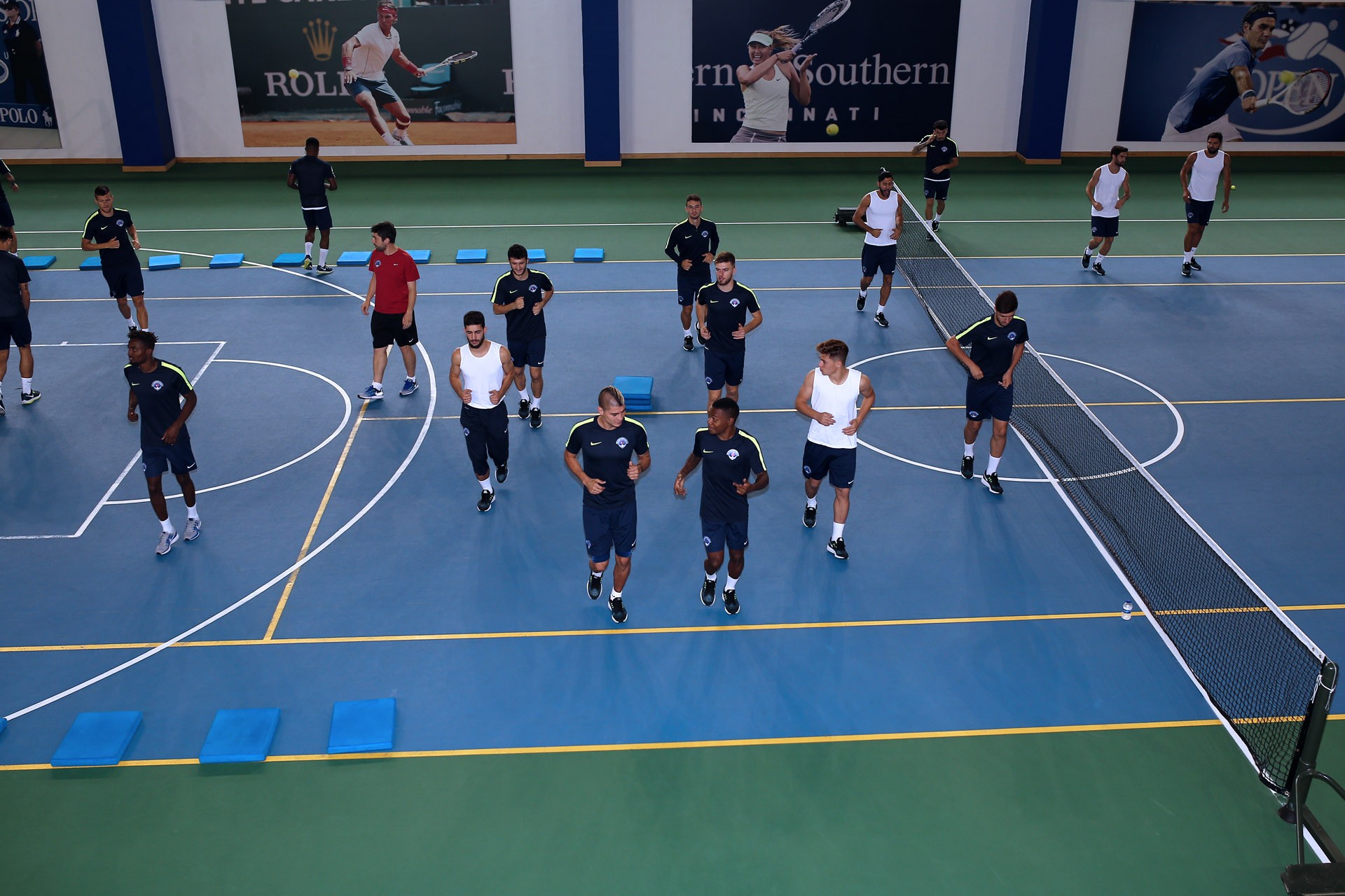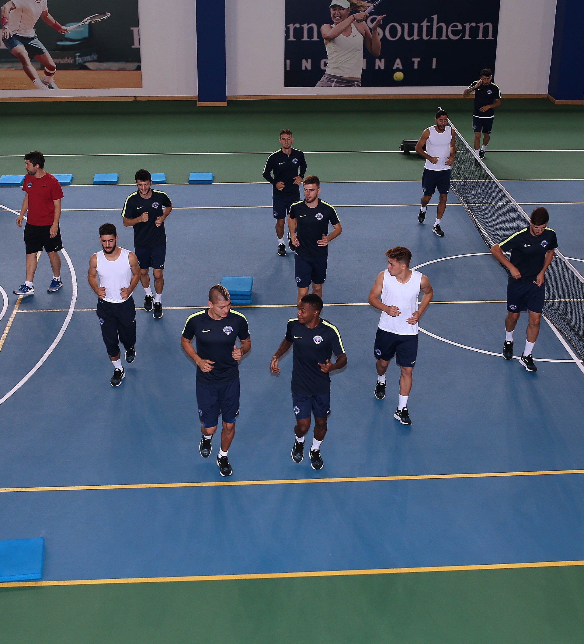 Antrenman takım halinde salonda yapılan ısınma hareketleri ve streching çalışması ile başladı. 7 istasyondan oluşan parkurda oyuncular üç tur üzerinden değişmeli olarak denge ve kuvvet çalışmalarını tamamladılar.