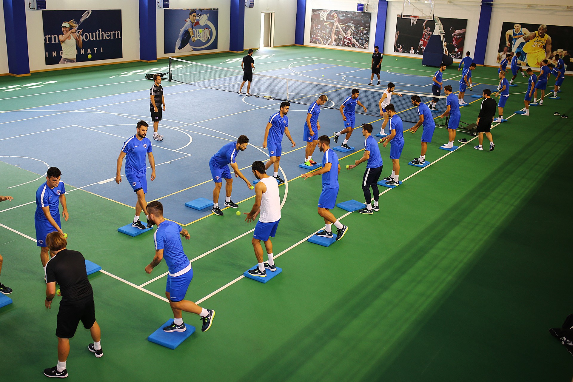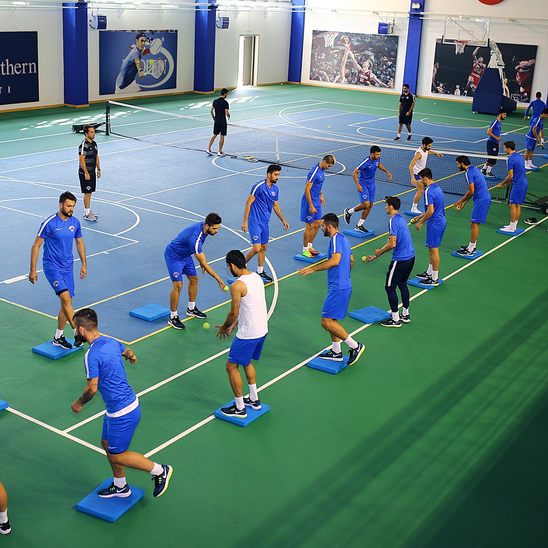 Antrenman takım halinde salonda yapılan ısınma hareketleri ve streching çalışması ile başladı. 8 istasyondan oluşan parkurda oyuncular üç tur üzerinden değişmeli olarak denge ve kuvvet çalışmalarını tamamladılar.