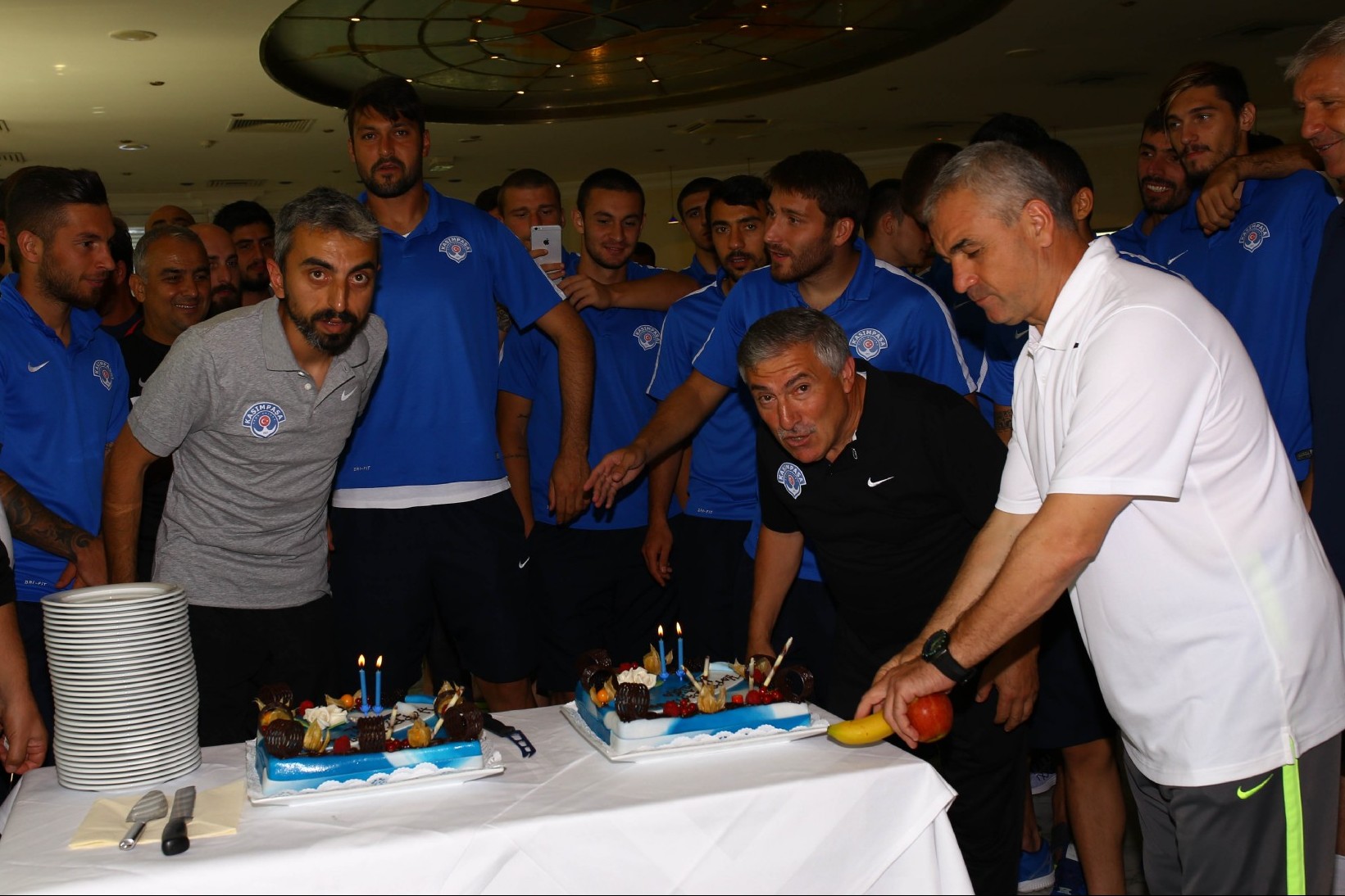 Futbol A Takımı fizyoterapistlerimizden Vural Akyıldız'ın ve malzemecilerimizden Mustafa Özen'in doğum günü, antrenman sonrasında Teknik heyetimiz, oyuncularımız ve personelimizin katıldığı törenle ve kesilen pastayla kutlandı.